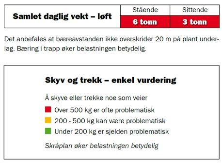 • Stående og gående arbeid: Total løftevekt per dag bør ikke overstige 6000 kg.