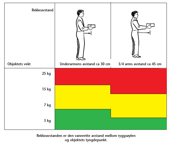 Skjema til vurdering av gjenstandens vekt relatert til avstanden fra kroppen (rekkeavstand).